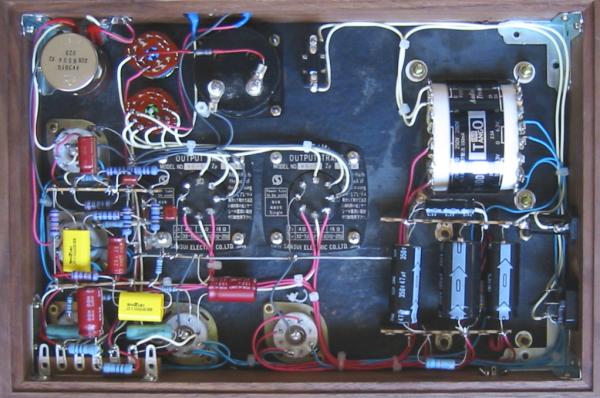 使い勝手の面から、入力の端子やスイッチ類はすべてシャーシ上面の前方に集めました。スイッチは、左が入力ボリューム、中上が出力インピーダンスの切り替え、中下がその右のメーターの表示切り替え、ジャンク品を修理したメーターは出力管のカソード電流の監視用。右のトグルスイッチが電源スイッチになります。