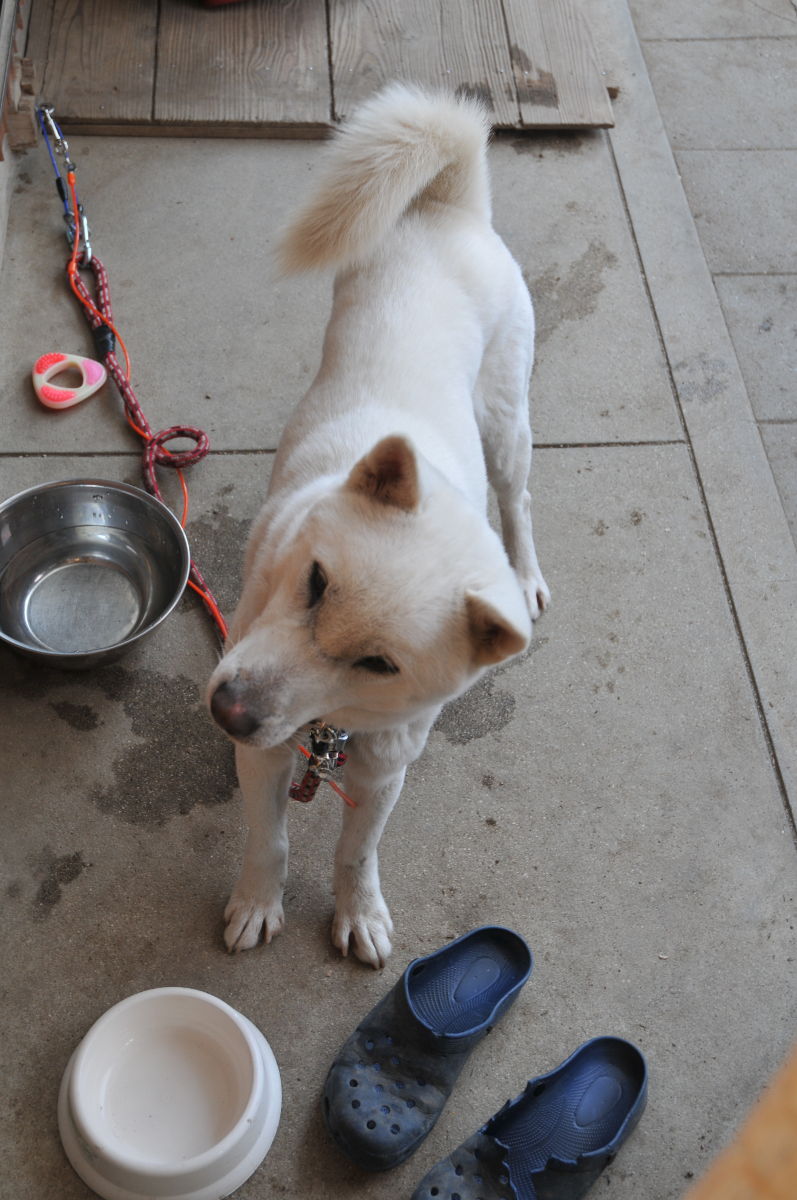 そうです。鈴鹿の保健所で保護されて、鑑札もなく、迷子の問い合わせもないまま「つむぎ」さんに引き取られたそうです。これも飼育放棄されたかその来歴は不明ですが、少なくとも人間に対する恐怖や憎しみは宿していないようです。ただし、「太郎」にはすでに譲渡を希望する人がいると聞かされました。